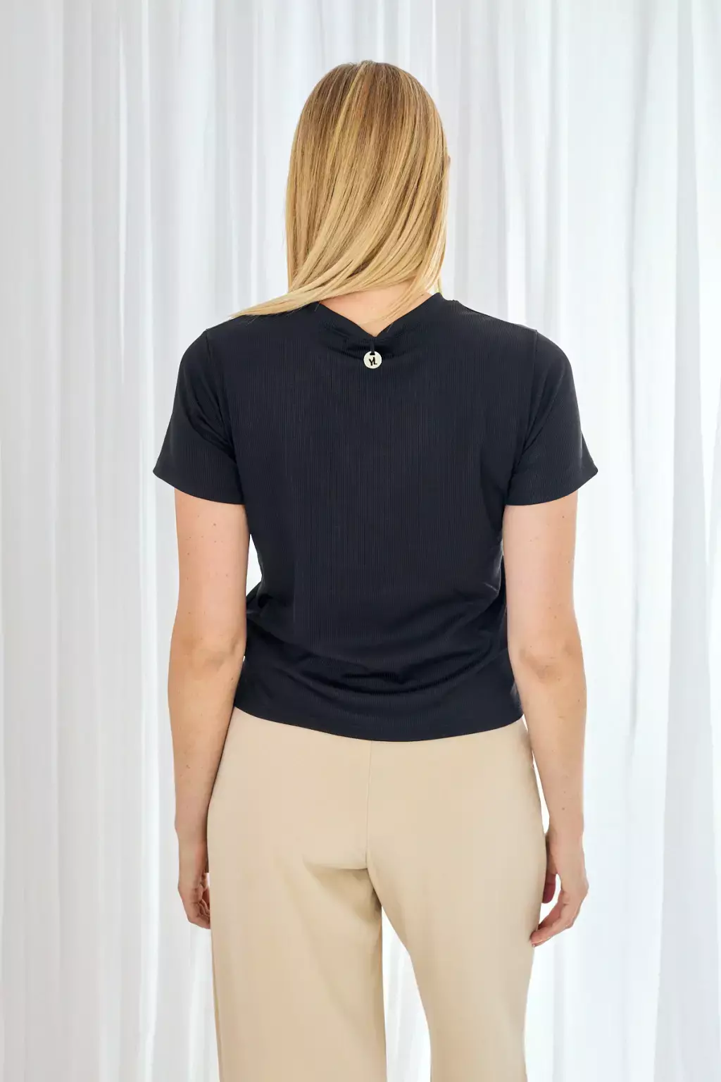 Top Largo Y Suelto, Manga Corta, Con Escote Redondo Y Tajos En Los Laterales. Confeccionado En Morley De Canelon Fino Con Foil