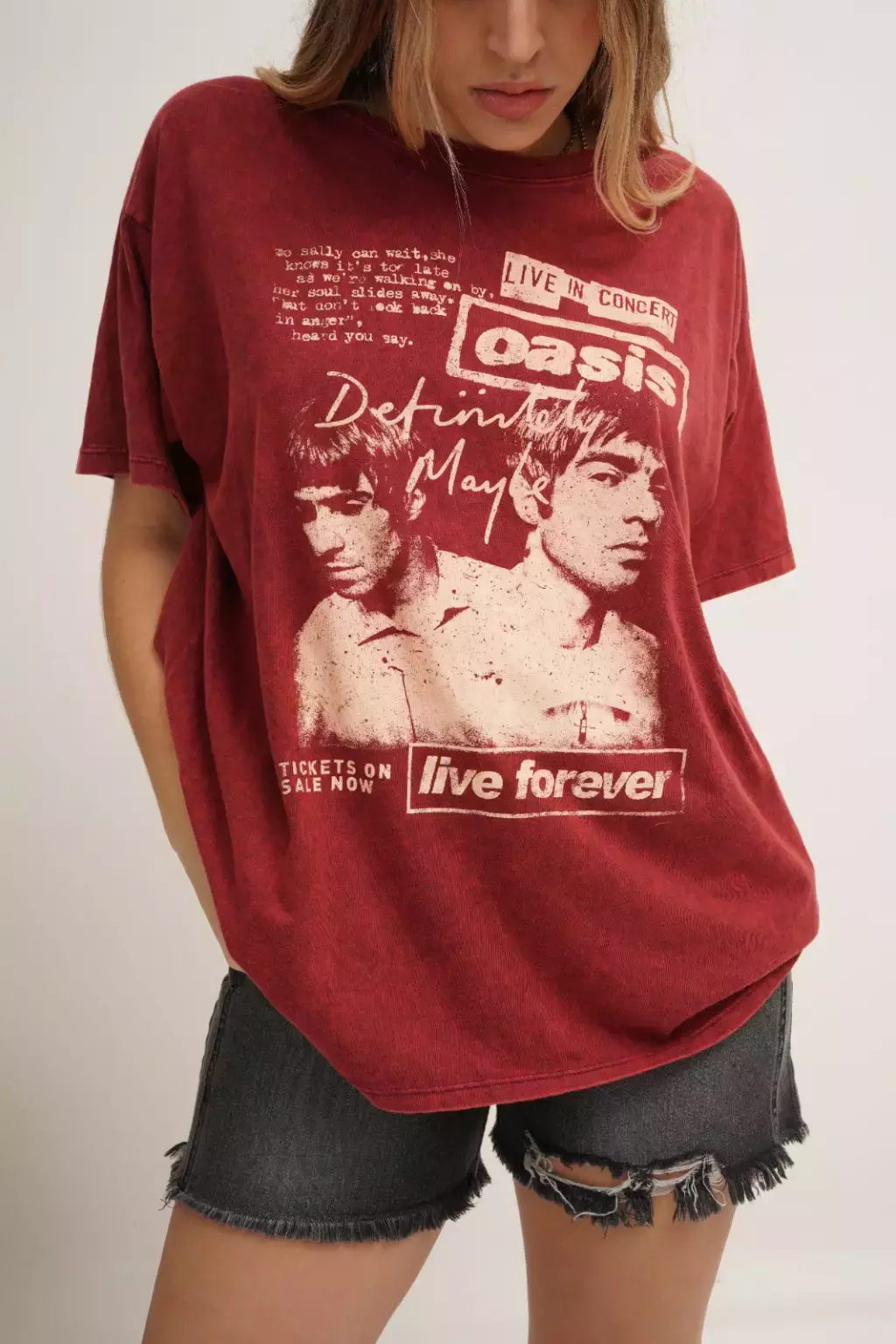 Remerón largo de manga corta con escote redondo, confeccionado en suave jersey procesado. Presenta una estampa en el frente inspirada en la icónica banda británica Oasis. India usa talle S completa el look con Bermuda Luton black