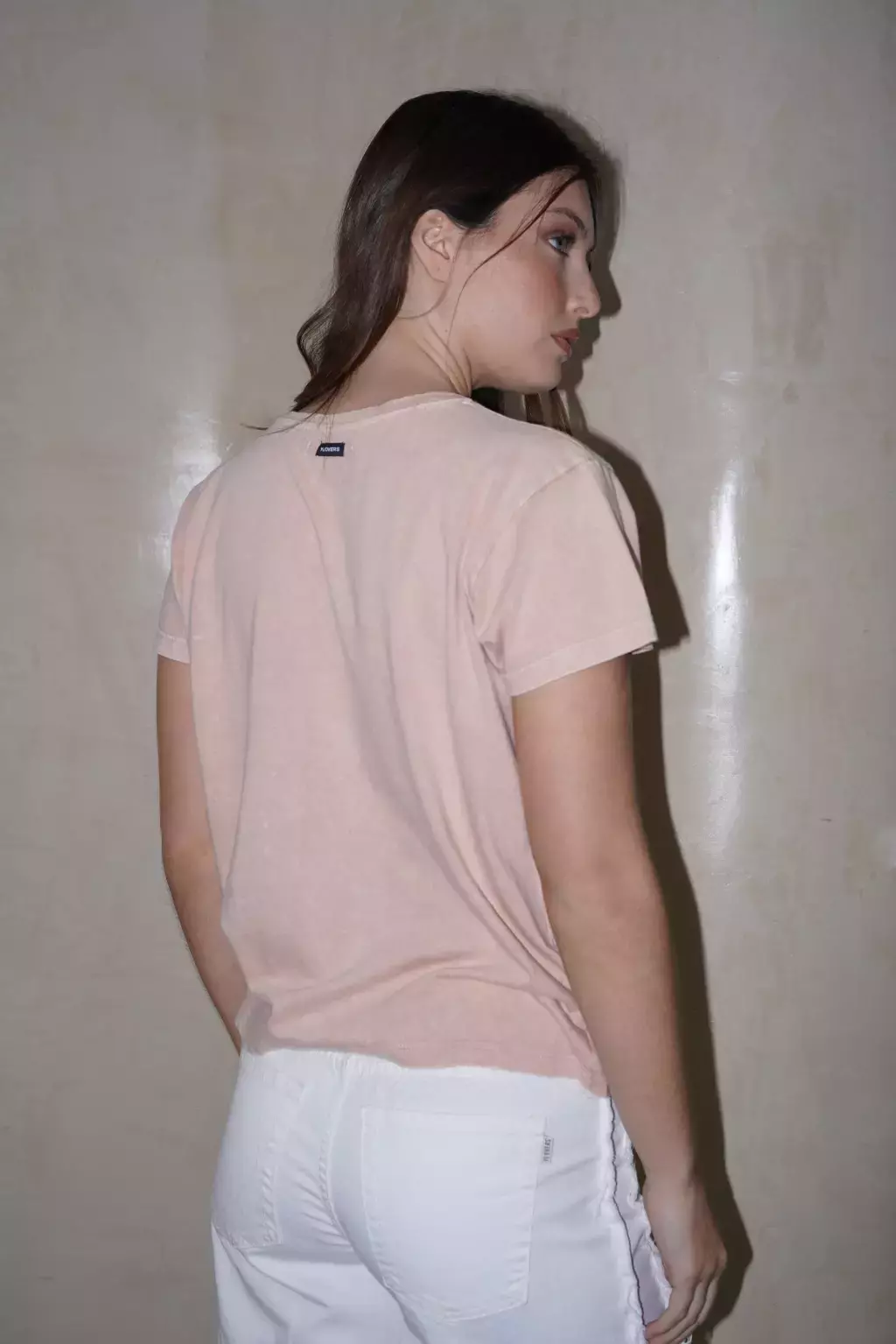 Remera de fit clásico, con escote redondo y manga corta. Confeccionada en jersey de algodón con efecto teñido y gastado láser, con diseño de strass aplicado en el frente.